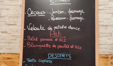 Smoothie: Ananas, mangue, orange Tartine: Tomates, mozzarella, jambon Plat chaud: Poulet massala, riz Desserts: Cookies vegan & sans gluten chocolat & noiset...