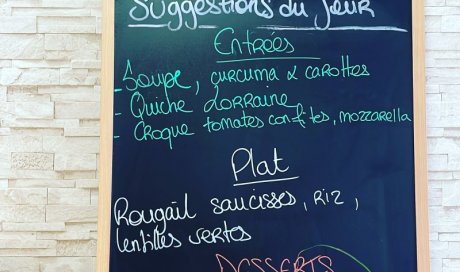 Soupe: lentilles corail, curry, coco (non végétarien) Quiche: jambon, poireaux Plat du jour: risotto, poulet et champignons Desserts: Cookies cacahuètes et cho...