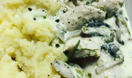 Soupe de pois cassés et carottes Ecrasé de pommes de terre à l'huile de truffe, poulet sauce forestière Banana bread au chocolat Tarte aux pralines Cookies chocolat e...