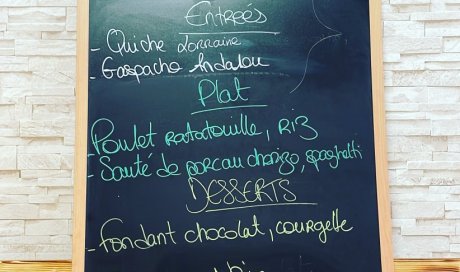 Gaspacho courgettes, basilic Quiche lorraine Gâteau Lyonnais (poires et parlines roses) Marbré chocolat et vanille