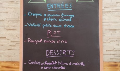 Soupe: Potiron Quiche: Jambon Plat chaud: Poulet coco, curry, riz Desserts: Cookies vegan et sans gluten au speculoos et chocolat Moelleux aux noisettes
